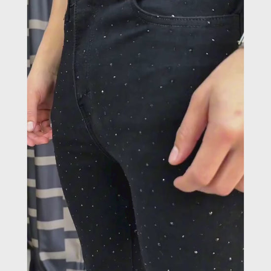 Calça Jeans preta skinny com modelagem justa, cintura intermediária e detalhes exclusivos em aplicações de strass com muito brilho, trazendo um toque de personalidade e exclusividade para quem tem estilo único. Confortável e super estilosa, é a escolha perfeita para quem busca uma peça diferenciada.