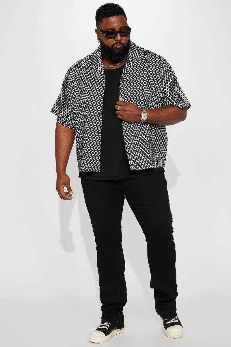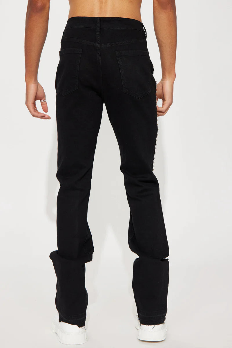 Calça Jeans preta com modelagem reta padrão, cintura intermediária e detalhes exclusivos em aplicações de strass na lateral com pedras de brilho, trazendo um toque de personalidade e exclusividade para quem tem estilo único. Confortável e super estilosa, é a escolha perfeita para quem busca uma peça diferenciada.