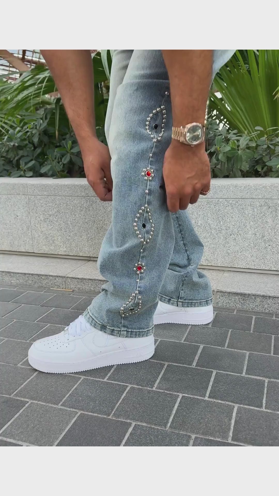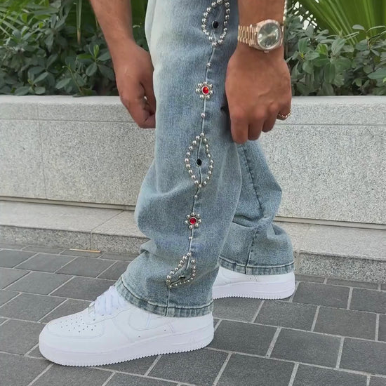 Calça Jeans street/oversized com modelagem reta e mais solta, cintura intermediária e detalhes exclusivos em aplicações de tachas metal collor nas laterais, trazendo um toque de personalidade e exclusividade para quem tem estilo único. Confortável e super estilosa, é a escolha perfeita para quem busca uma peça diferenciada.