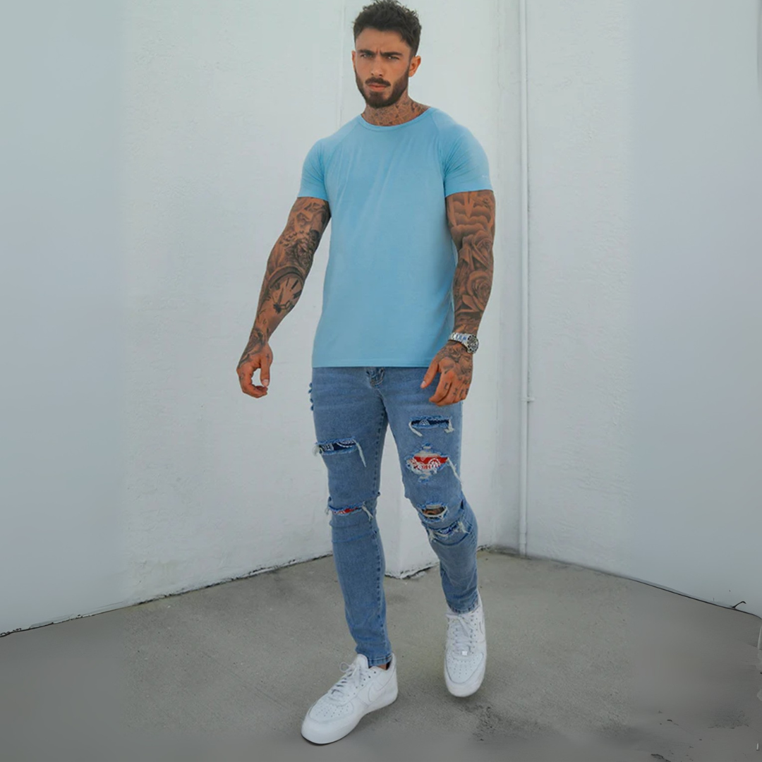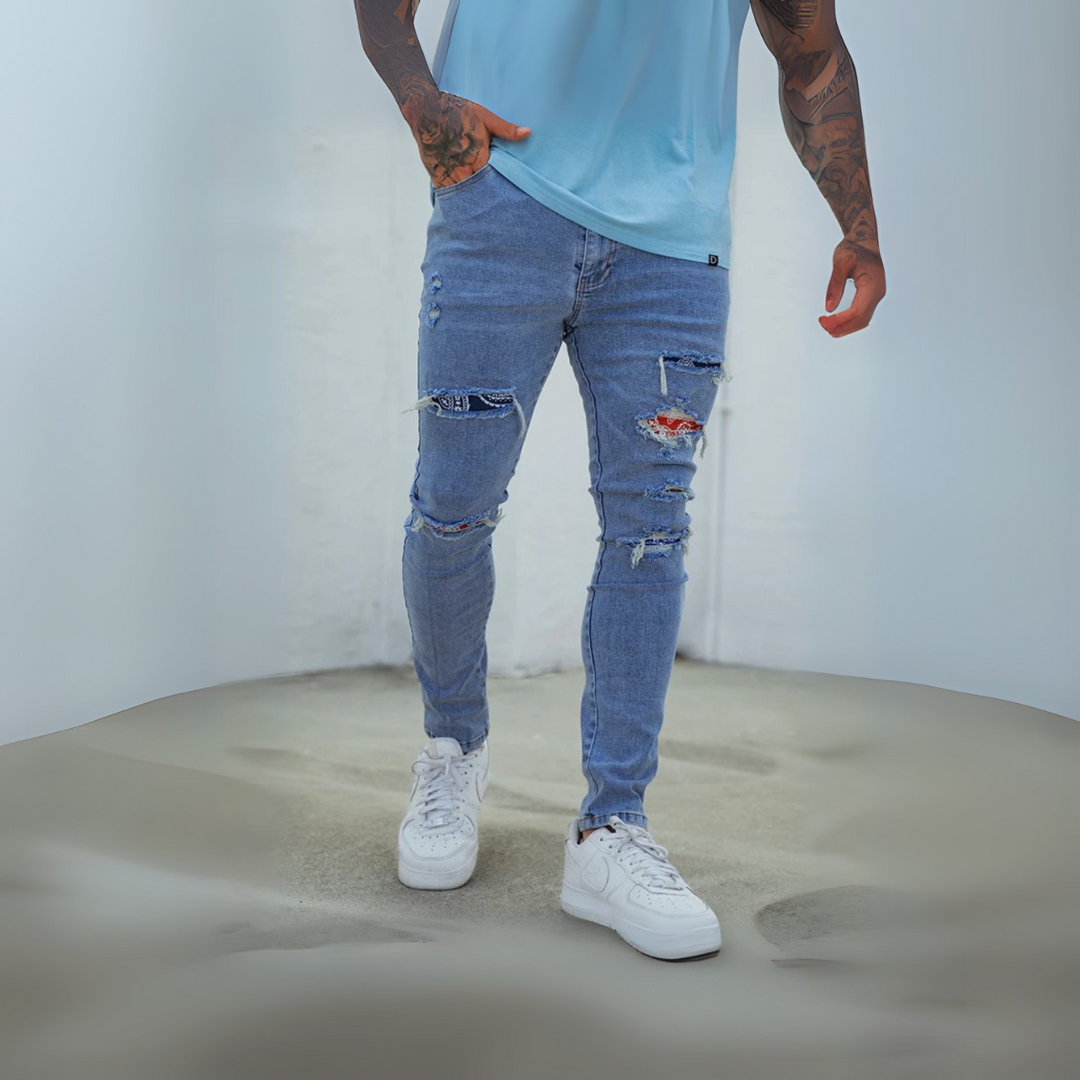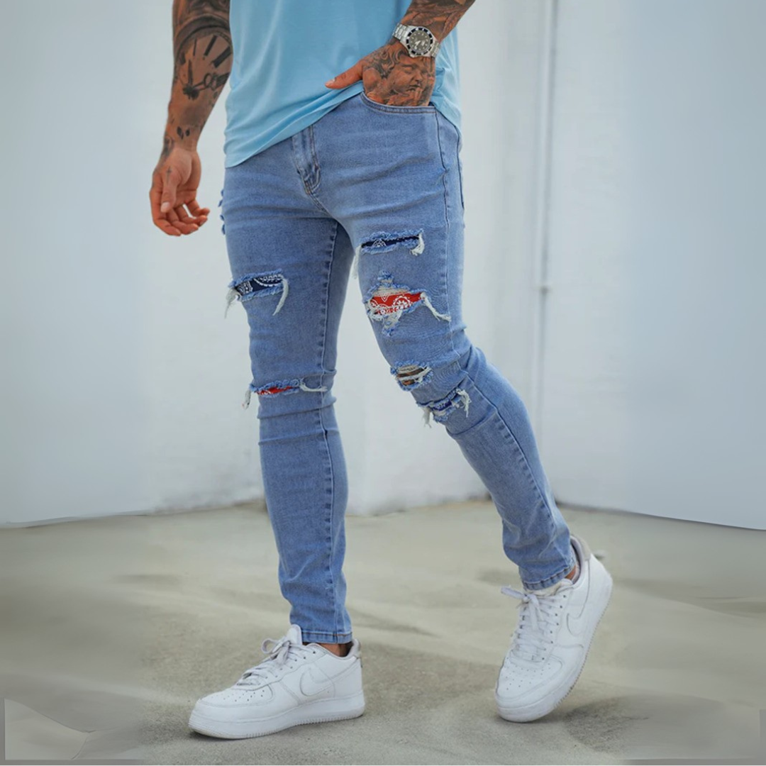 Seu grande destaque fica por conta das aplicações em bandanas nos tons vermelho e azul, em harmonia com o efeito destroyed ao longo das pernas, criando um visual urbano, ousado e cheio de personalidade. Com lavagem pensada para compor diversos tipos de looks, essa calça é extremamente versátil – transita bem entre o casual e o streetwear, sendo perfeita para quem busca autenticidade sem abrir mão do conforto,