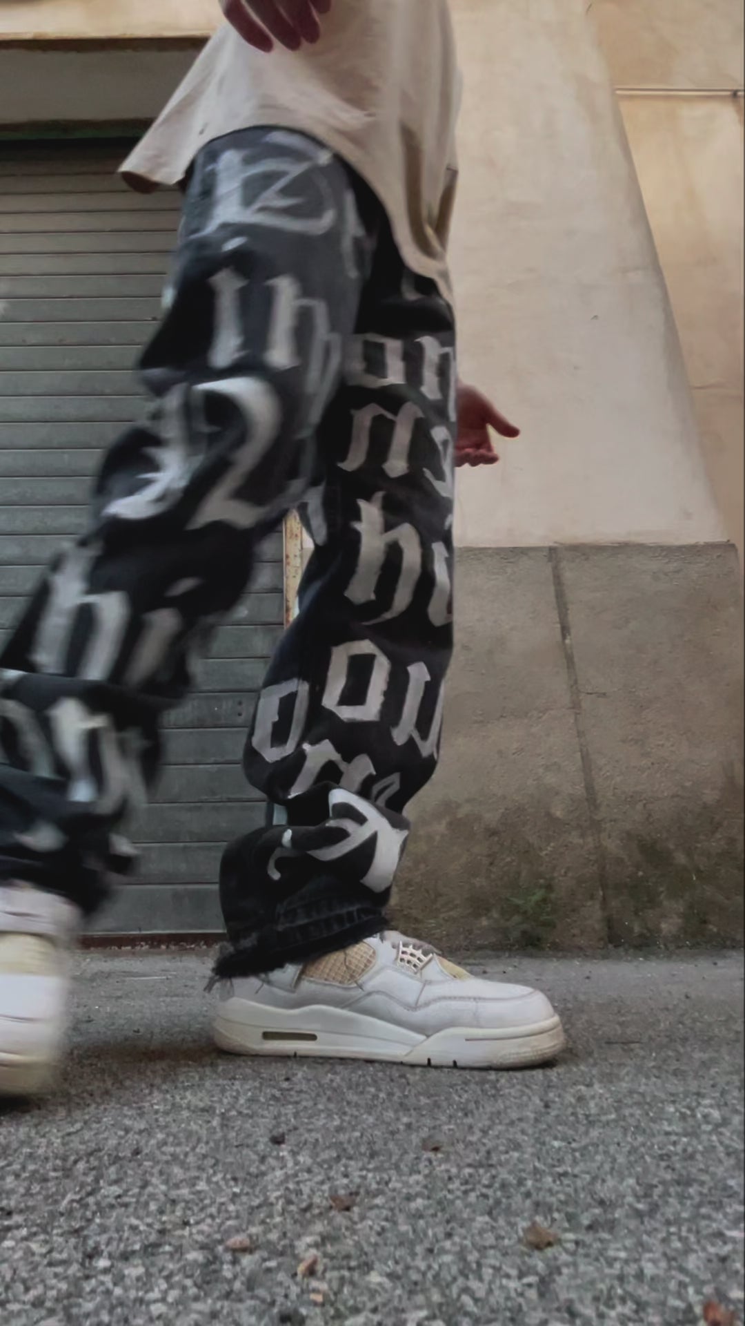Calça Jeans street/oversized com modelagem reta e mais solta, cintura intermediária e detalhes exclusivos em escrita medieval pigmentada e pintada à mão, garantindo uma peça única e cheia de personalidade. Ideal para quem busca estilo, conforto e autenticidade.
