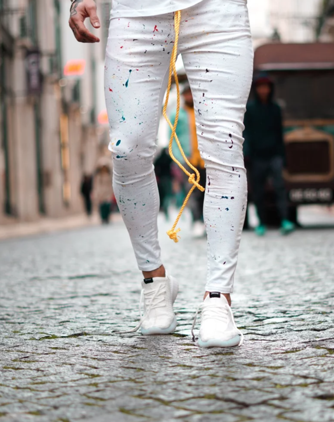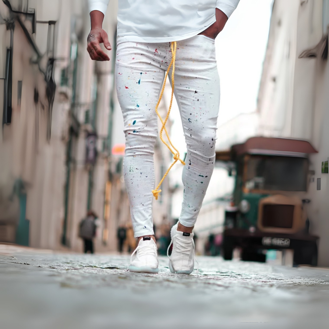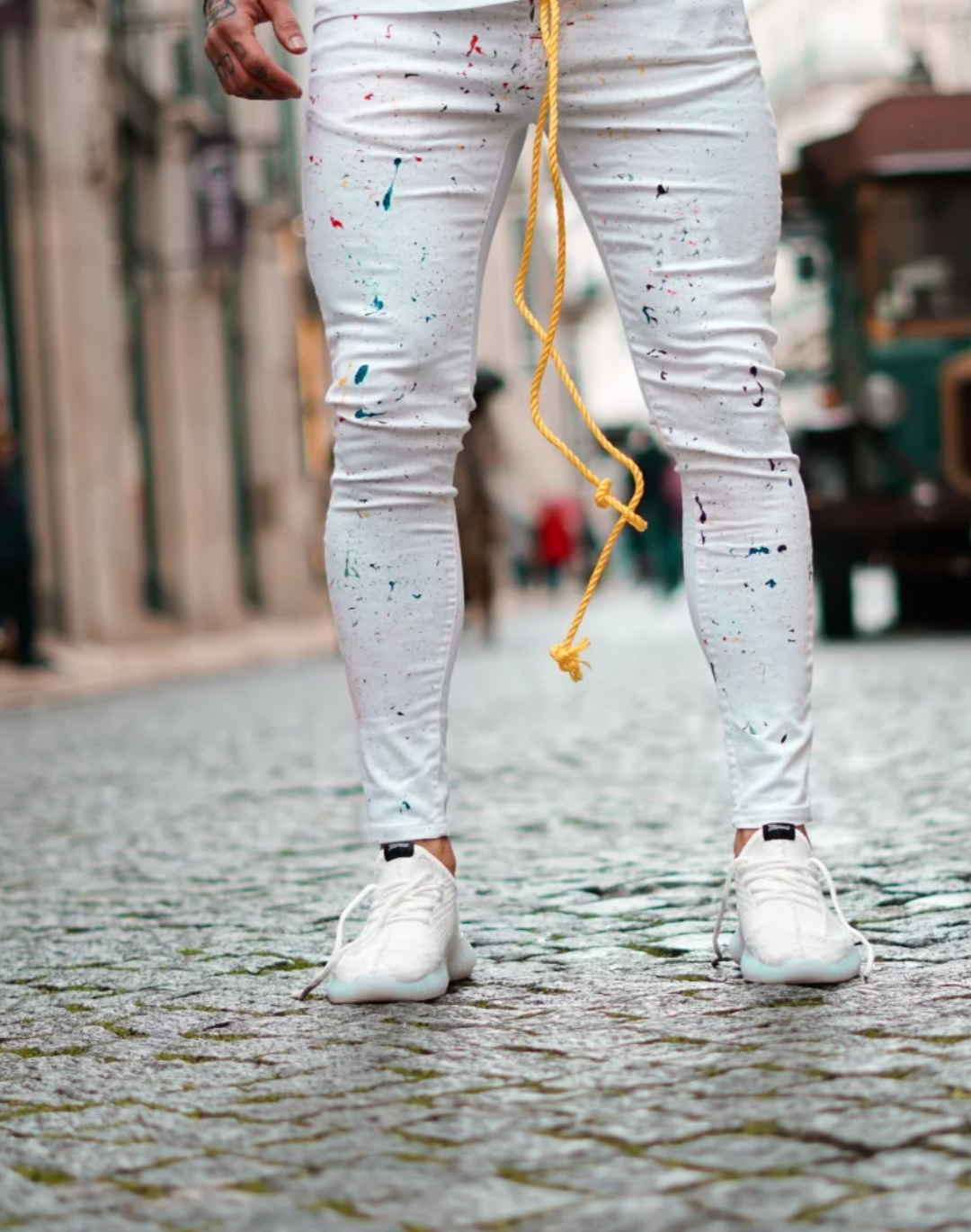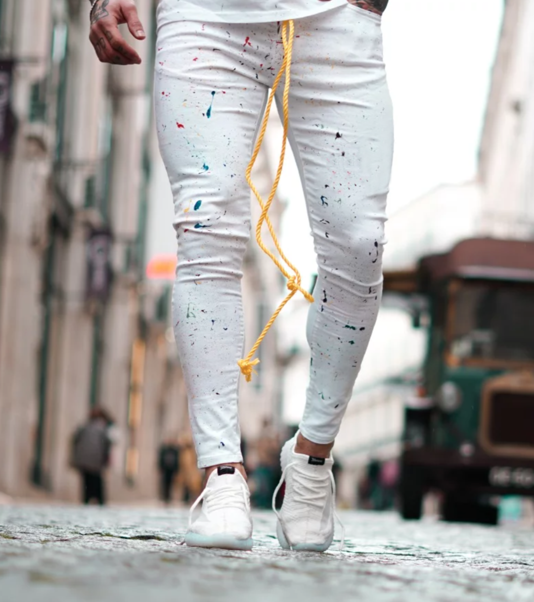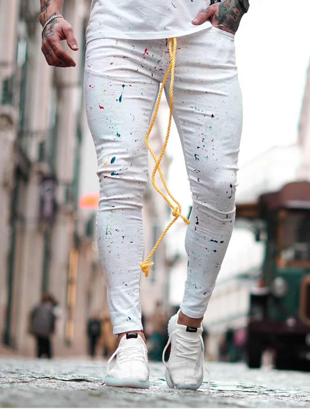Calça Sarja/Jeans com elastano, com detalhes pigmentados collors sobre toda a peça, destacando-se pelo cordão alongado amarelo no cós, que proporciona um toque diferenciado e único. A composição em sarja oferece toque suave e conforto absoluto.
