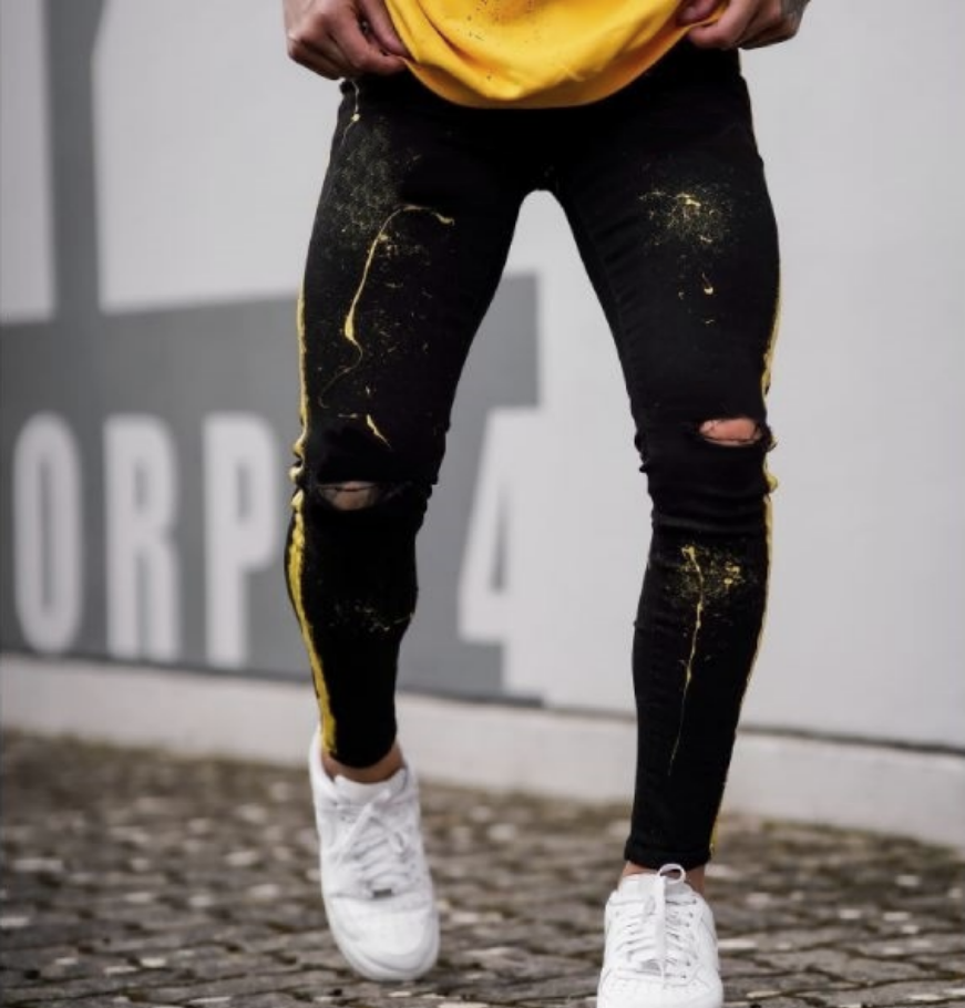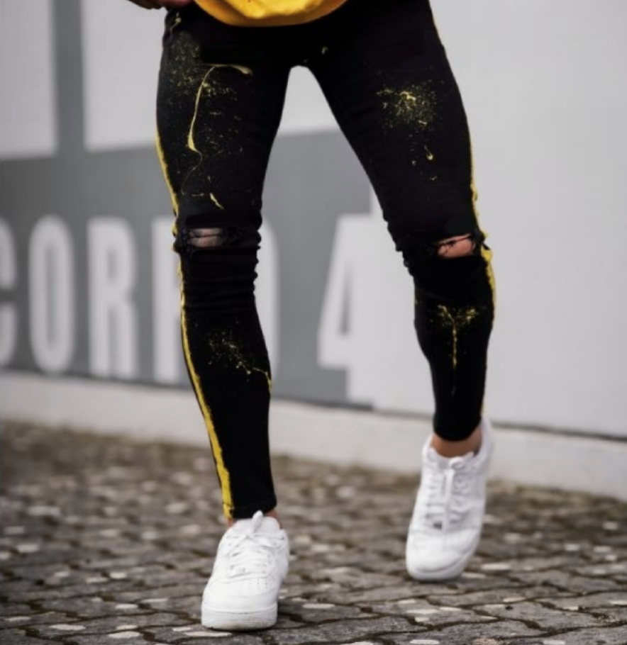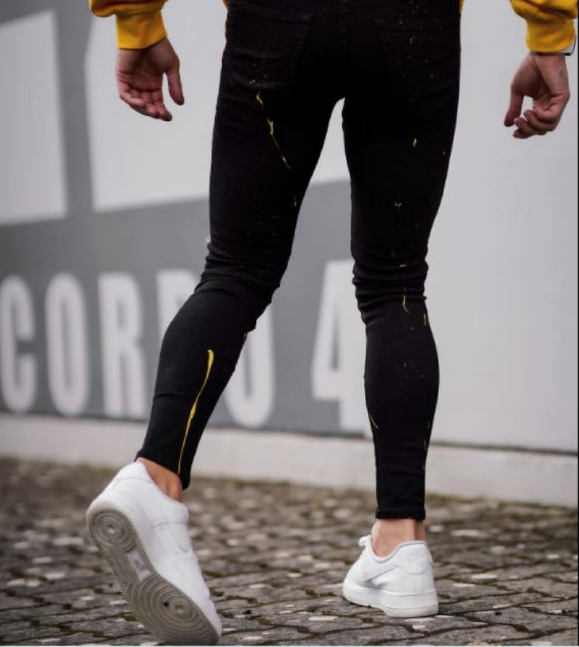 Calça Jeans Preta com elastano, modelagem skinny levemente reta que valoriza o corpo sem abrir mão do conforto. Com faixa amarela lateral e detalhes em pigmentação artística nas pernas, esta peça entrega um visual moderno, exclusivo e cheio de personalidade.